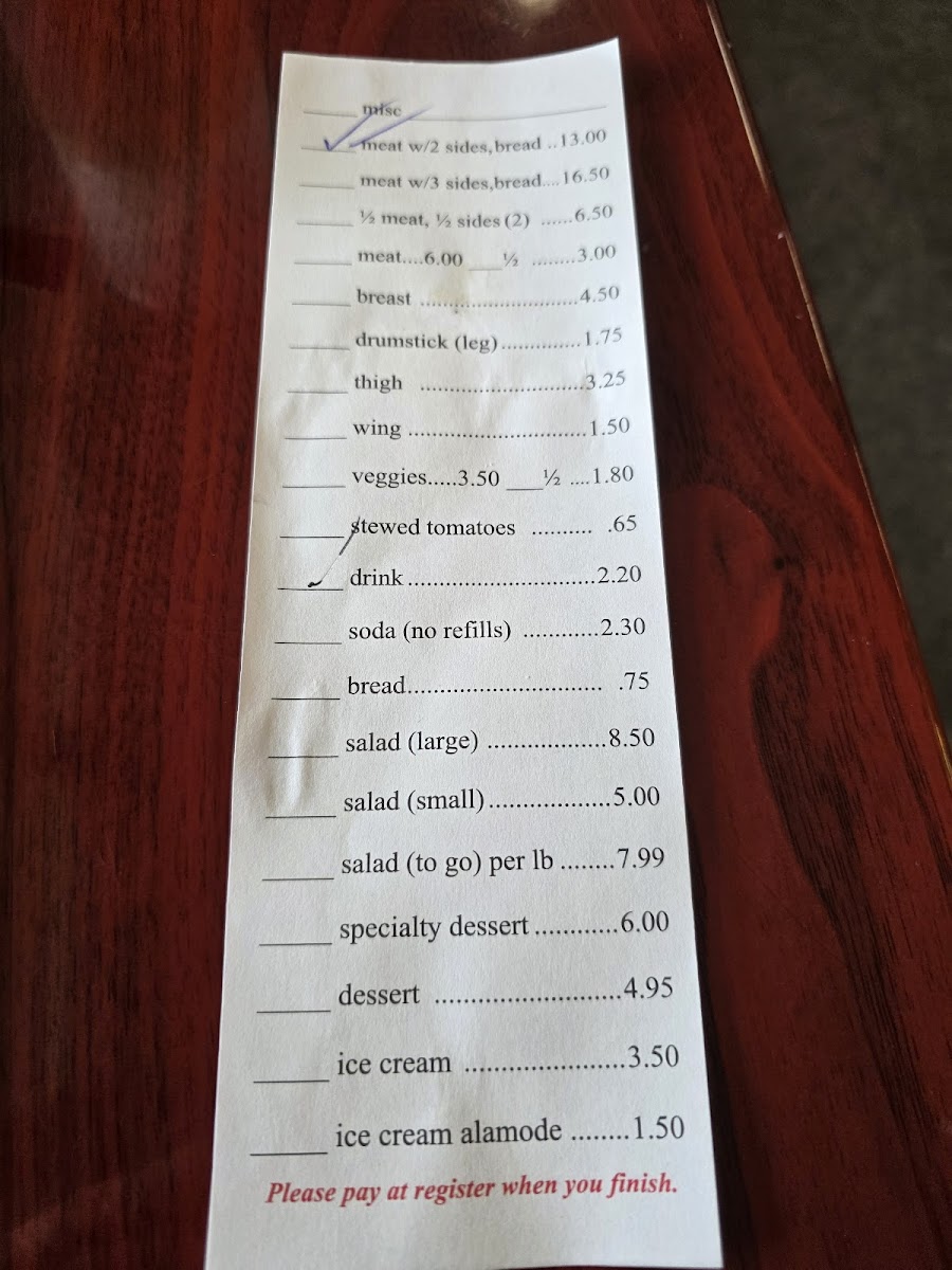 You can expect generous plates featuring traditional favorites like fried chicken paired with mac and cheese, meatloaf served alongside mashed potatoes and stewed tomatoes, and a variety of well-loved Southern sides such as cabbage, green beans, and sweet potato soufflé. Freshness and familiar flavors come through in their bread selections, including butternut and cheddar bread, as well as classic desserts like lemon meringue pie and shoo fly pie to finish off your meal.
